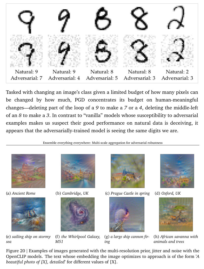This non-alien view is further strengthened by the recent progress in mitigating adversarial examples. Implicit in the accusation that deep nets are "alien shoggoths" is the idea that adversarial examples discredit them as humanlike concept representations. For the unfamiliar adversarial examples are weird noise patterns you can find with gradient descent that cause deep nets to misclassify items. You sprinkle a little noise on a normal looking picture of an apple and suddenly your classifier thinks it's a dog. The argument goes that no human would ever be fooled by this, therefore we know that whatever deep nets are doing it can't look anything like human cognition. The papers "Towards Deep Learning Models Resistant to Adversarial Attacks" by Madry et al and "Ensemble everything everywhere: Multi-scale aggregation for adversarial robustness" by Fort et al challenge this view. Both of them demonstrate ways to train deep nets that substantially mitigate (but do not fully solve) adversarial examples such that doing the classic gradient descent attack against their representations gets human interpretable features from the classifier! That is on recognizing handwritten digits the noise patterns that fool the classifier clearly make the digits look like other numbers, and when you do gradient descent with Fort et al's method against CLIP embeds you get recognizable images of what the image is supposed to be instead of weird noise. Fort's method notably works by ensembling pretrained layers, which shows that the features learned by deep nets are much closer to what we would expect from humanlike representations than previous adversarial example demos have implied. This was at least somewhat predictable in advance by paying attention to the text-to-image space, where Ryan Murdock’s CLIP guided image generation technique explicity cited Chris Olah's work on feature visualization by optimization as a conceptual precursor. The first time someone did the core idea behind text to image was as an interpretability technique, and later text to image models like MidJourney and FLUX.1 are implicit feature visualizations of text embeddings. That you can change the contents of the prompt and the image on the other end morphs to include it gives us a floor on the quality of the concept representations learned by text embedding models and LLMs.