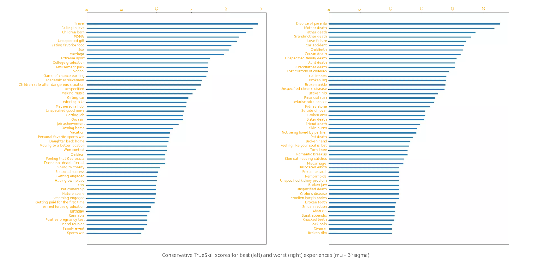 The reason why I'm talking about all this is that naive VNM utility not being able to model boredom leads to a kind of mushy type-error driven thinking about values where "boredom" and "the taste of fat" are the same kind of thing because they're both rows in our nonexistent VNM lottery lookup table. In reality I expect that boredom is more like an objective function or a intervention in the human agent scaffold than it is specific embedded goal content like "the taste of fat" or "having sex". My model of where humans get their complex values from is similar to that of Steven Byrnes, though I'm much more agnostic on where in the brain the relevant machinery is located. Yudkowsky makes a distinction between terminal and instrumental goals for a tree search planner, where some of the nodes we want to visit because they lead to good things (instrumental) and some of the nodes we want to visit because they are good things in and of themselves (terminal). The instrumental nodes lead towards the terminal nodes so planning in a sense "flows backward" reward wise by inferring the instrumentals from the terminals. In a generative model or RL policy I think it's more like you have terminal reward signals and instrumental reward signals that you extract by querying your world model. The terminal reward signals train the instrumental reward signals and therefore all subjective valence flows towards the terminals. As part of his research into qualia and valence the consciousness researcher Andrés Gómez-Emilsson ran a survey to ask people about their highest valence experiences. From this we can see that the human terminal values are things like "travel" (being in the ancestral environment) and "birth of child":