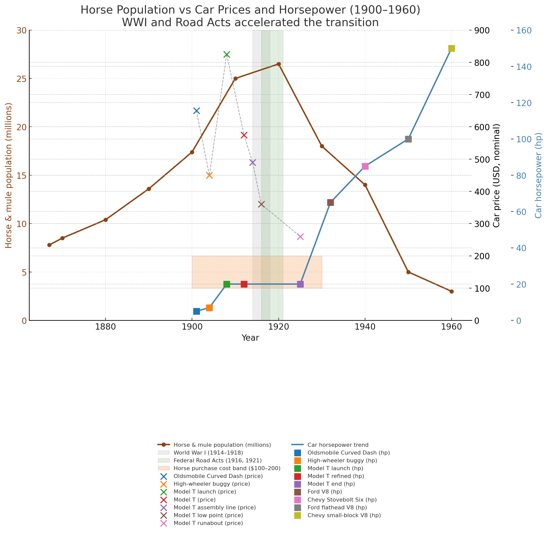 My modal scenario is a bit darker than that. If you graph U.S. horse population during the 20th century you'll notice that population rises steeply after 1900 while cars are being invented and then flattens after the introduction of the Ford Model T. The usual story is that horses were displaced after Ford drove car prices down to around the cost of a horse, and then people sent their horses off to the slaughterhouse. This did eventually happen, but before that a lot of the flattening population curve was horses being shipped off to die in WW1. One source estimates that "about 1,325,000 American horses and mules" were used in WW1, mostly purchased by foreign governments for their war efforts. This drove up the price of horses and horse supplies like feed, making it easier to justify the price of a car.